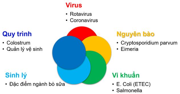 Có 03 nhóm nguyên nhân chính gồm có: (1) Quy trình chăn nuôi, (2) Sinh lý và (3) Vi sinh vật bao gồm Virus, Vi khuẩn và Nguyên bào gây ra tình trạng tiêu chảy trên bê, thậm trí khi các nguyên nhân này đồng thời tác động sẽ khiến cho tình trạng tiêu chảy diễn tiến càng thêm phức tạp (Hội chứng tiêu chảy phức hợp).